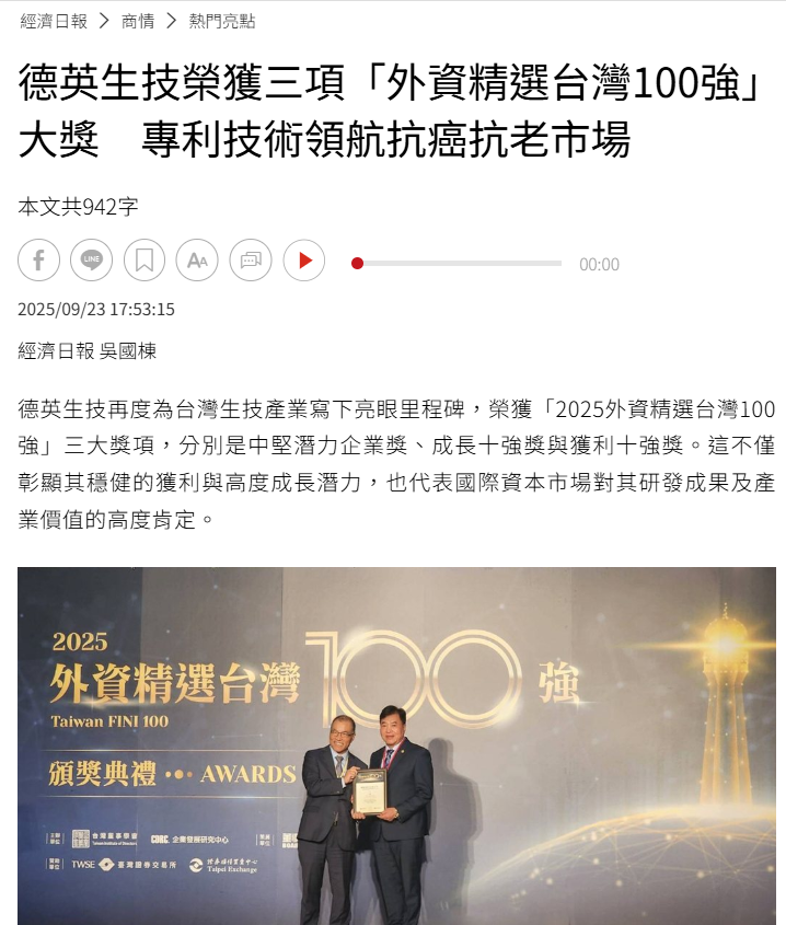 下一篇114.09.10感謝!工商時報報導 德英生技 榮獲外資精選台灣100強「中堅潛力企業、成長10強、獲利10 強」三大獎~