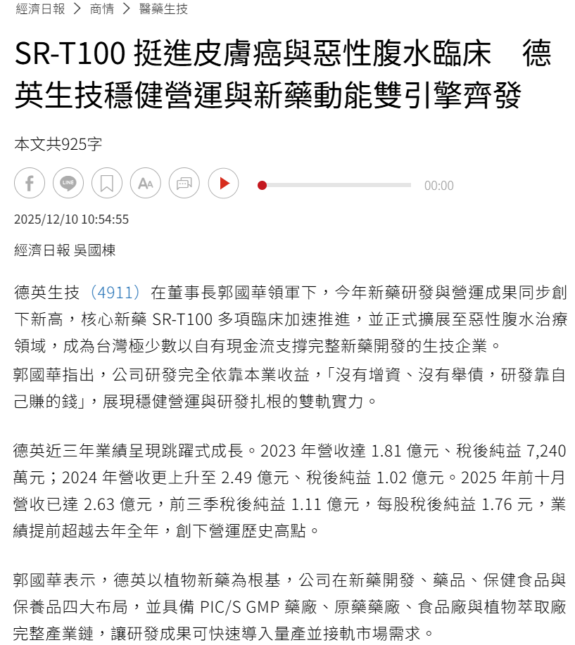 德英生技核心新藥 SR-T100 多項臨床加速推進,